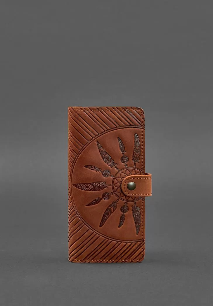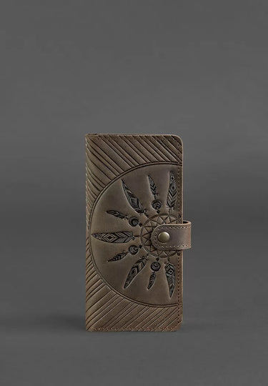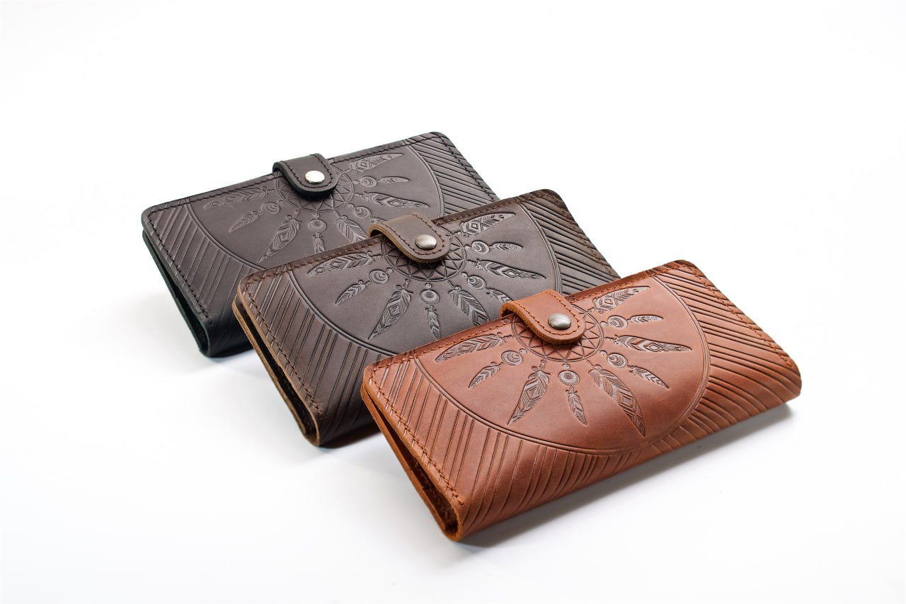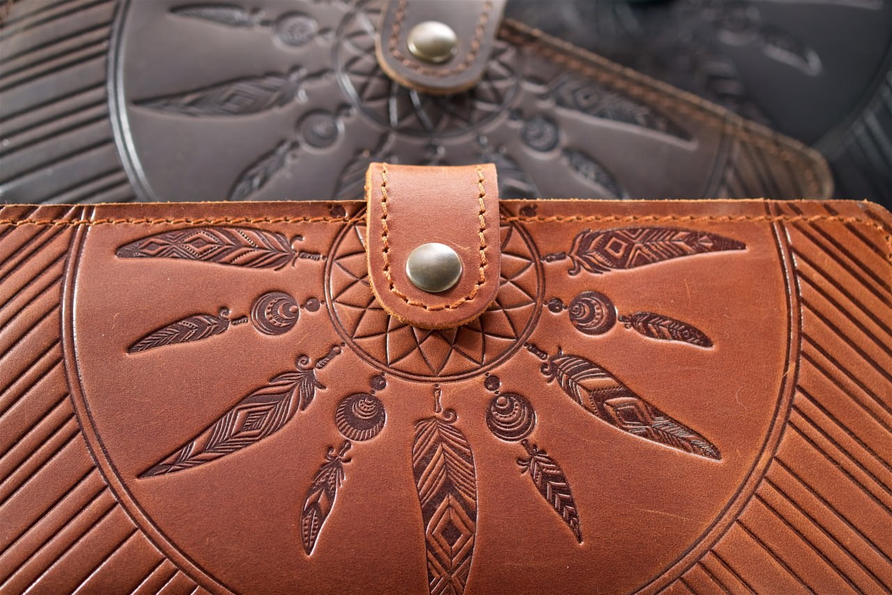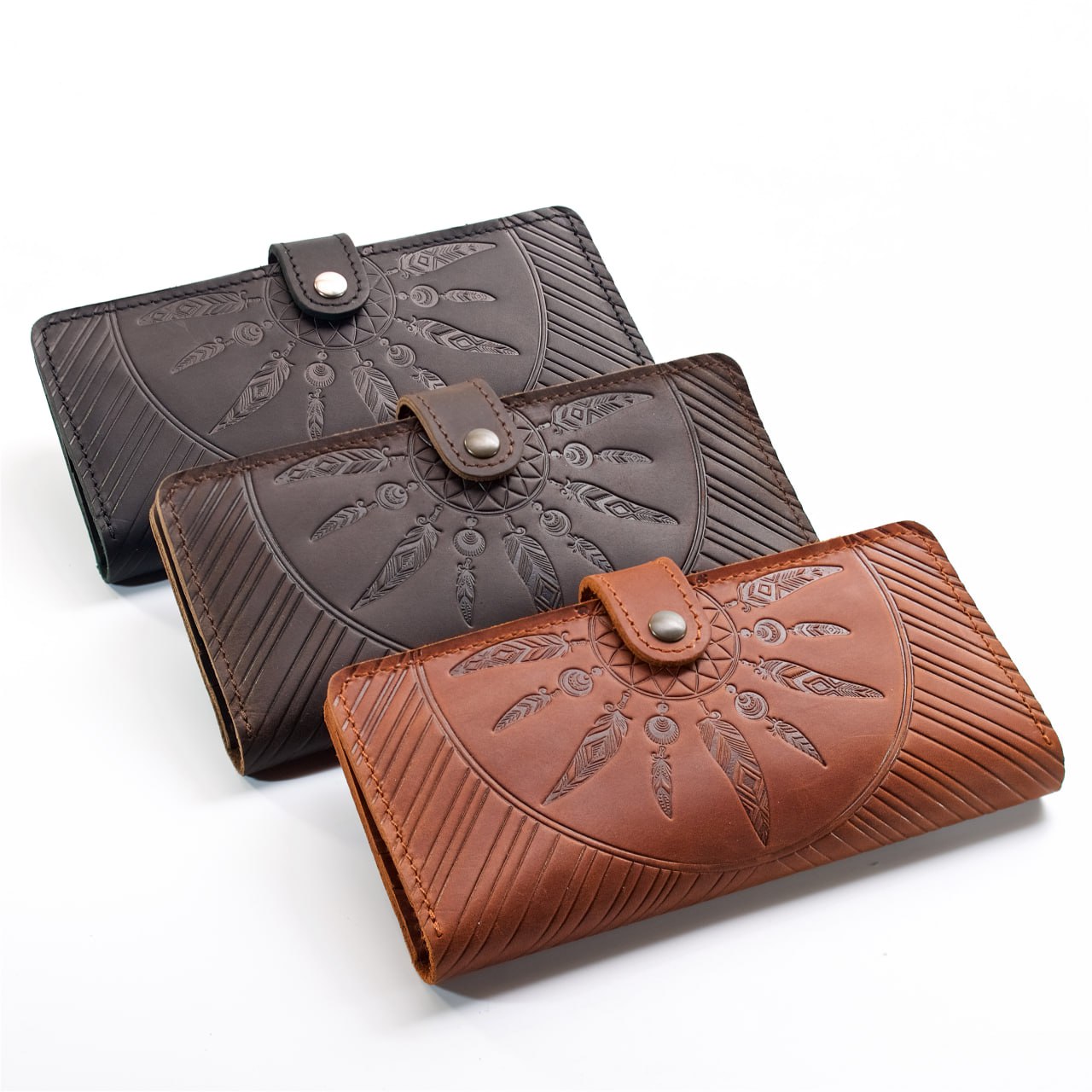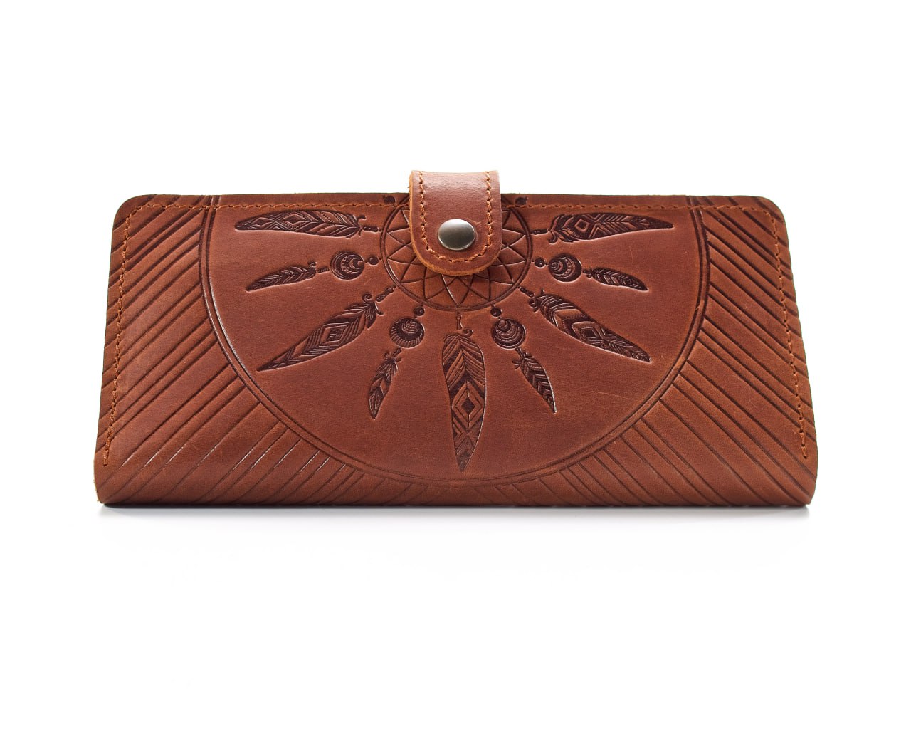 Rich in tone and meaning, this women's wallet in classic brown is crafted for those who appreciate timeless style with a symbolic twist. The embossed dreamcatcher design adds depth and personality, making it a standout among ladies wallets. Inside, you will find multiple card slots, a zippered coin pocket, and a spacious bill section — perfect for organizing your essentials whether at home or abroad.